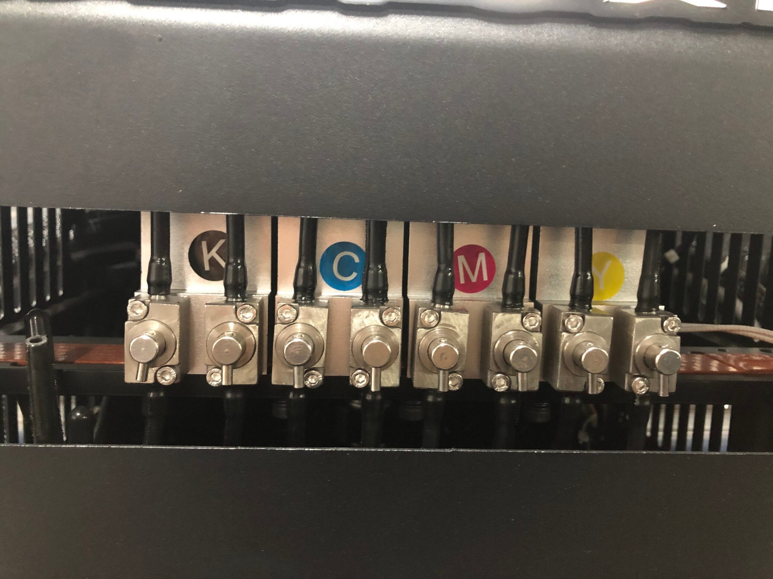 Максимальное количество печатающих головок Ricoh, которые можно разместить, равно шести. Возможны такие конфигурации, как W CMYK, W CMYK V и WW CMYK CMYK.